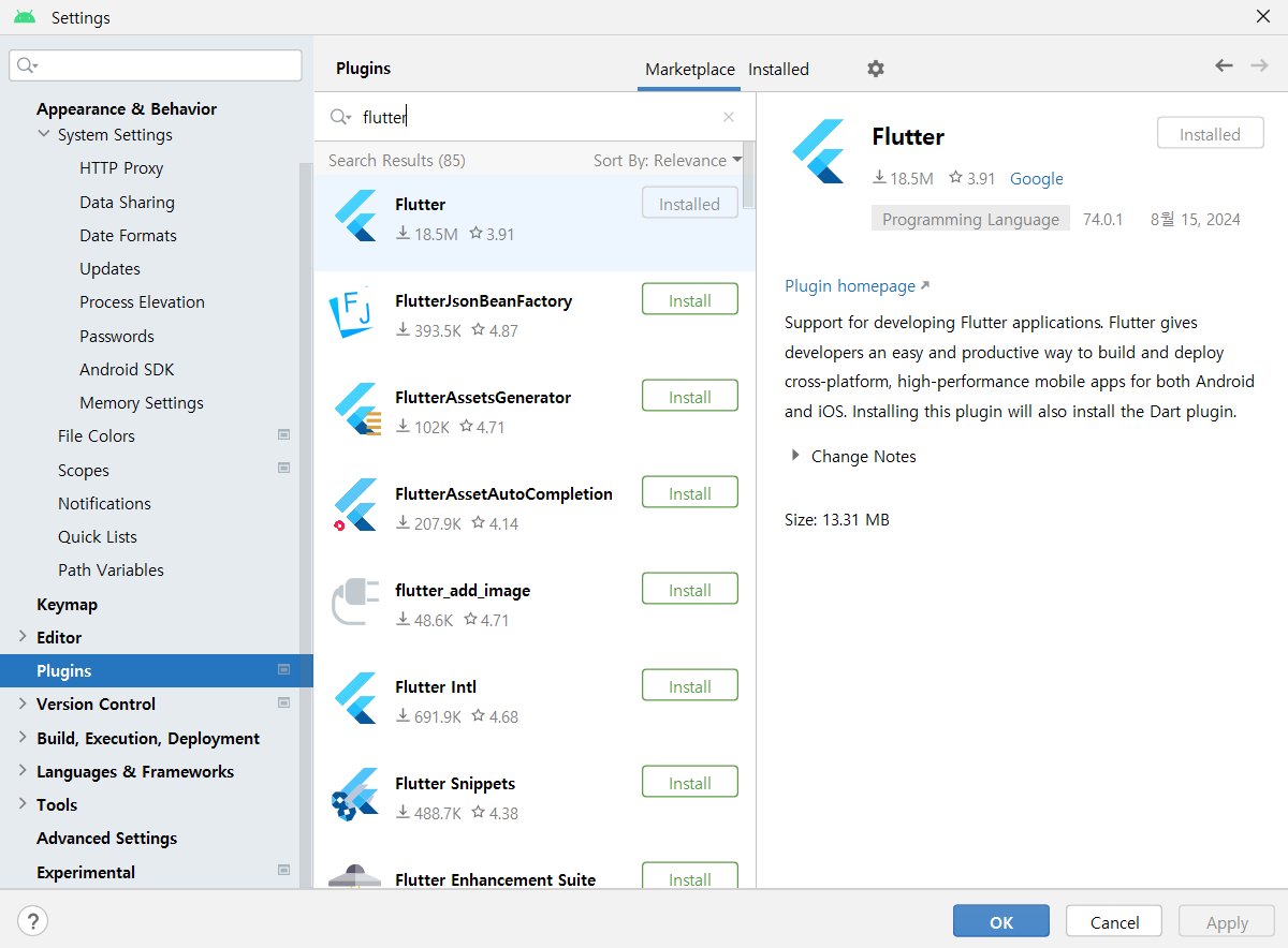 - Marketplace 탭에서 Flutter를 검색하고, 플러그인을 설치합니다.