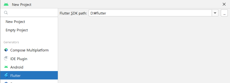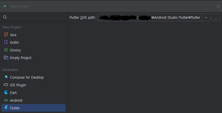 프로젝트 생성시 Flutter SDK를 설치한 폴더를 지정해줍니다.!!!!