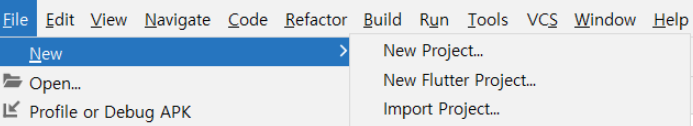 - 안드로이드 스튜디오를 실행한 후 New Flutter Project를 선택합니다.